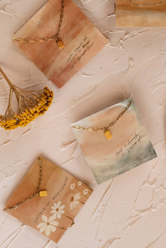 Come to me, all you who are weary and burdened, and I will give you rest. Matthew 11:28 Double-sided tag on dainty paperclip chain Tag size: 5x7mm Adjustable 16-18" 14kt Gold Plated Hypoallergenic Tarnish + Water Resistant