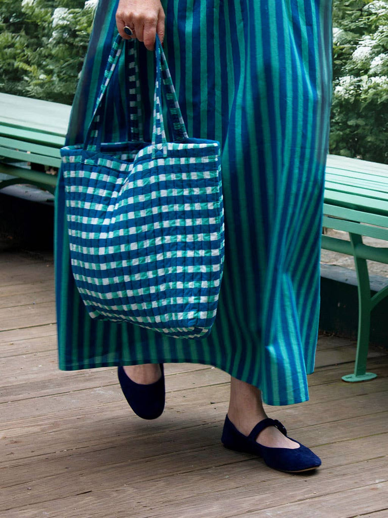 Our first ever O&I tote bags have arrived and we are obsessed! Choose between the smaller quilted Everyday Tote, perfect for, well, every day - roomy but not overly so and the bigger quilted Everything Tote, the one that you'll take to the beach, for a weekend away or even for a large haul at the farmers market. They both have ties to keep the contents of your bag secure and an internal pocket to keep essential items organized. If you like this new gingham block print, we've also used it to make quilted pouches, pjs and scrunchies. The bags were styled with our new Natalie sundress (the green stripe version worn as a skirt) and the Lara dress in our geo print.