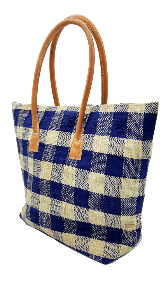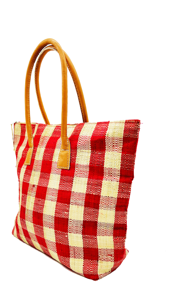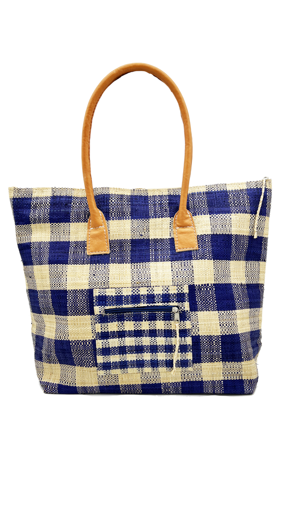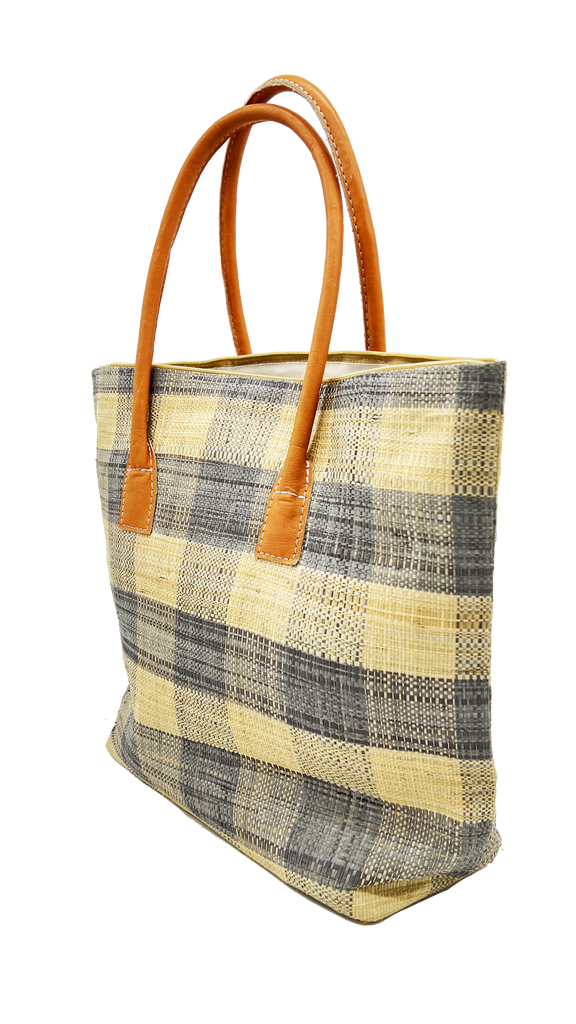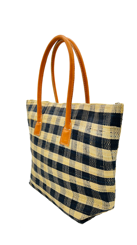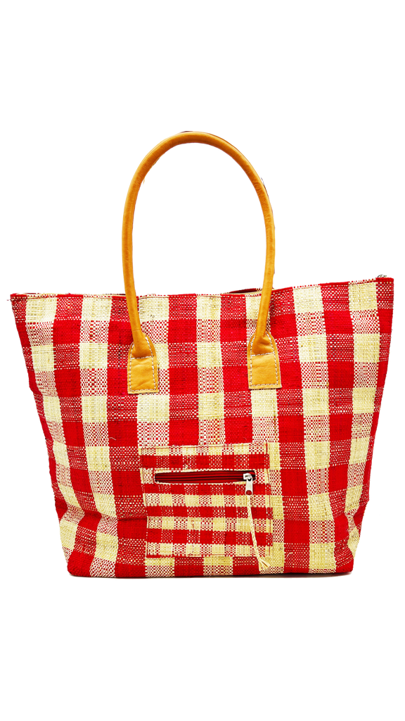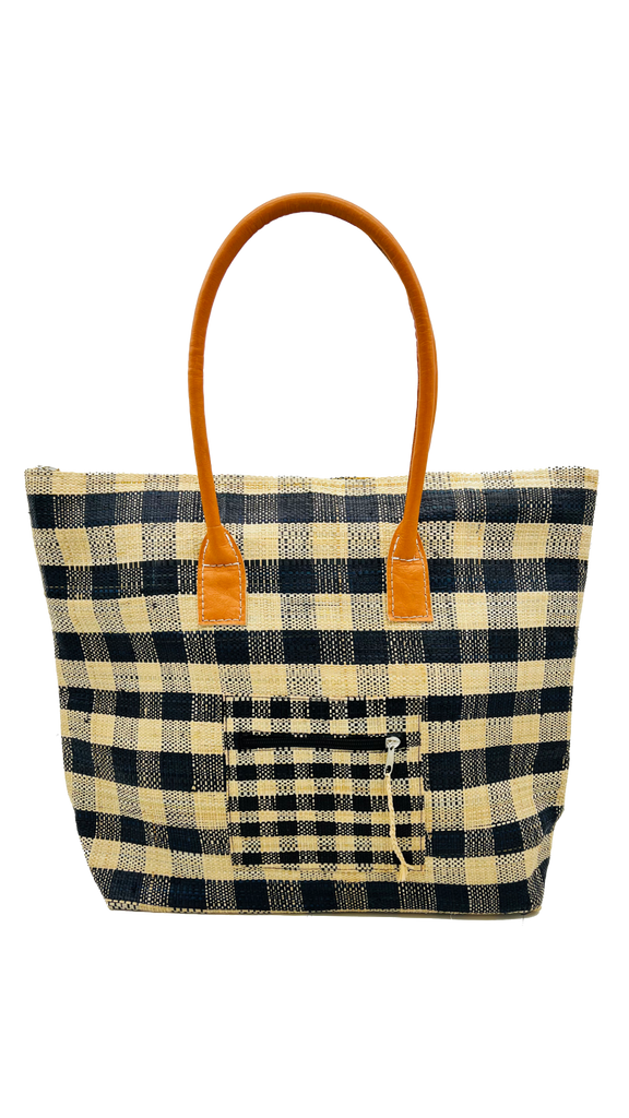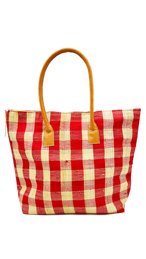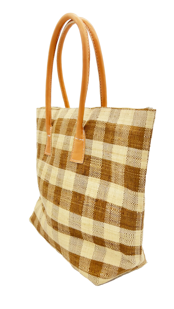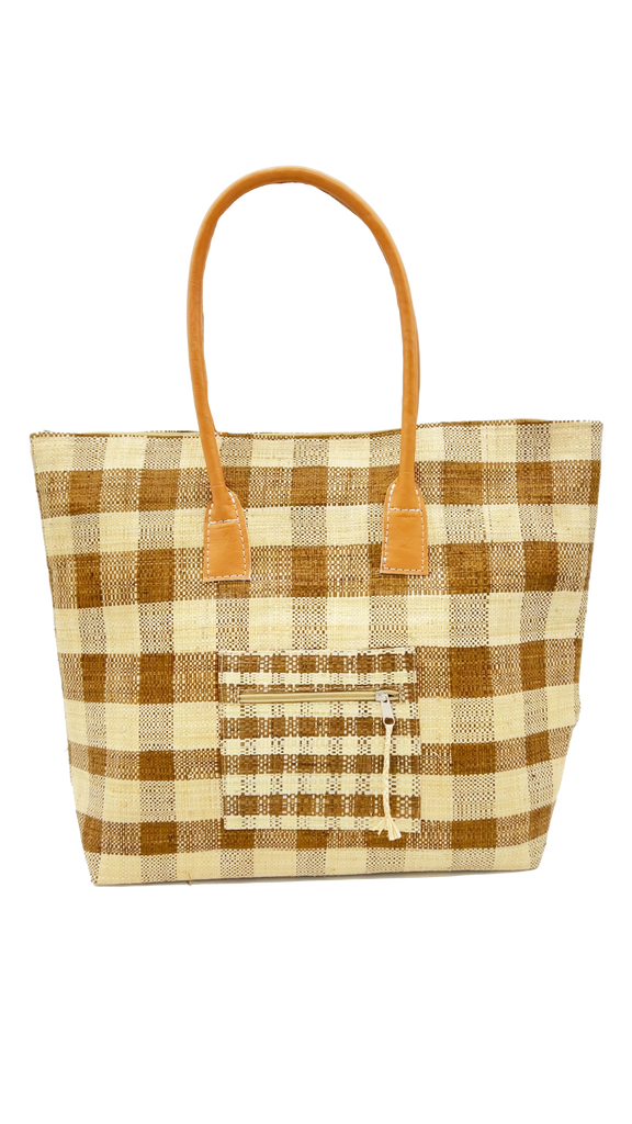 / Shebobo - Nador Gingham Zippered Straw Tote Bag - Packs Flat!: Tobacco