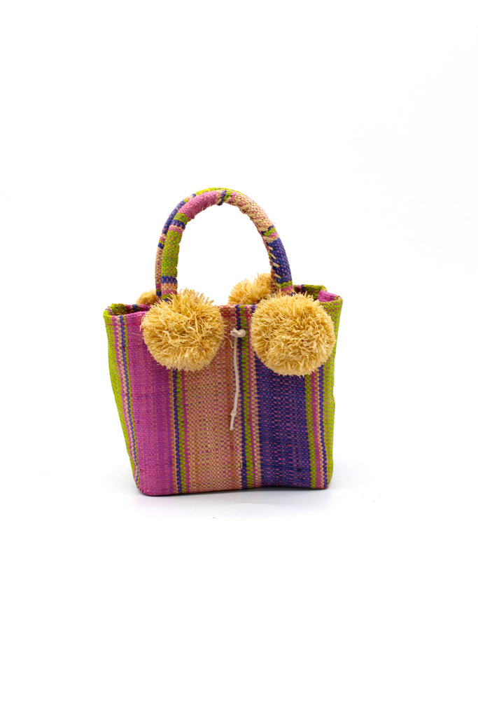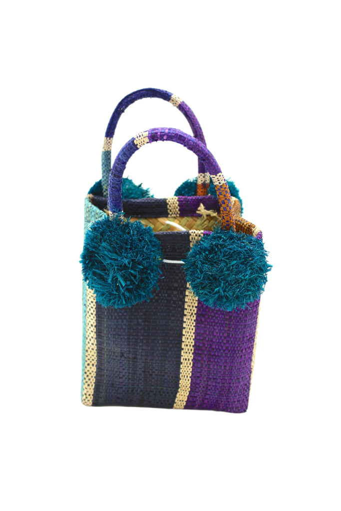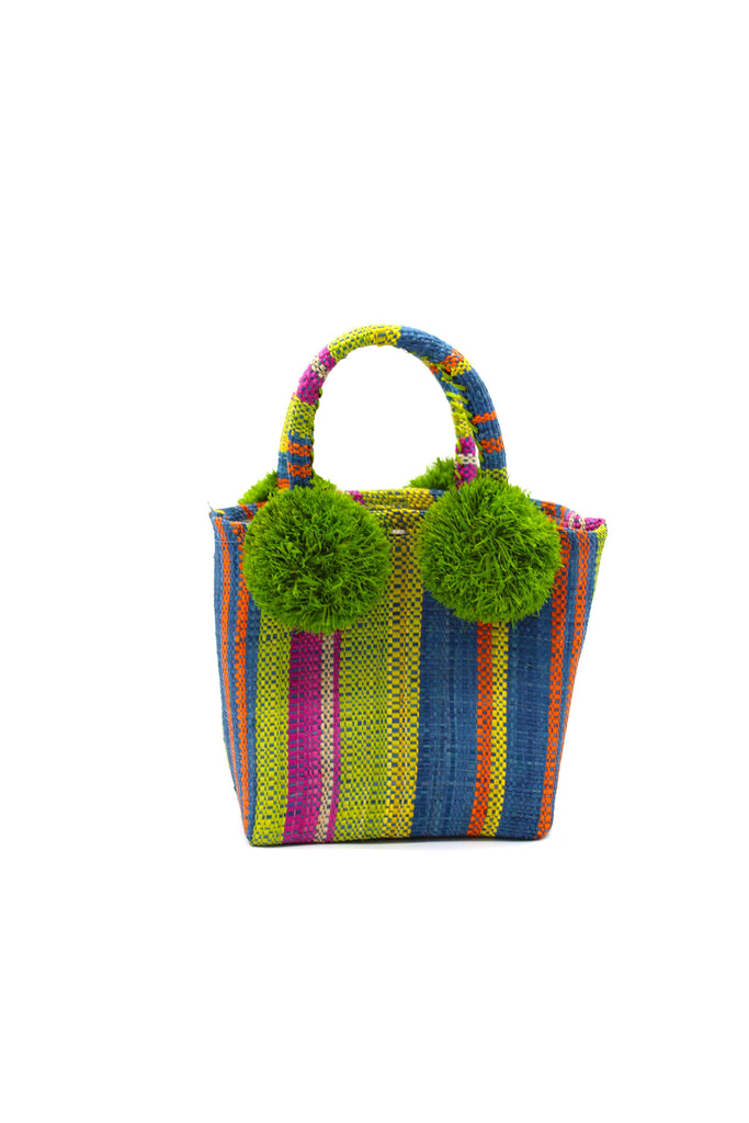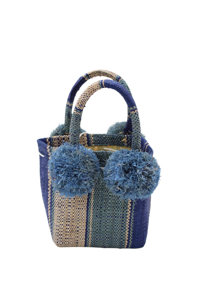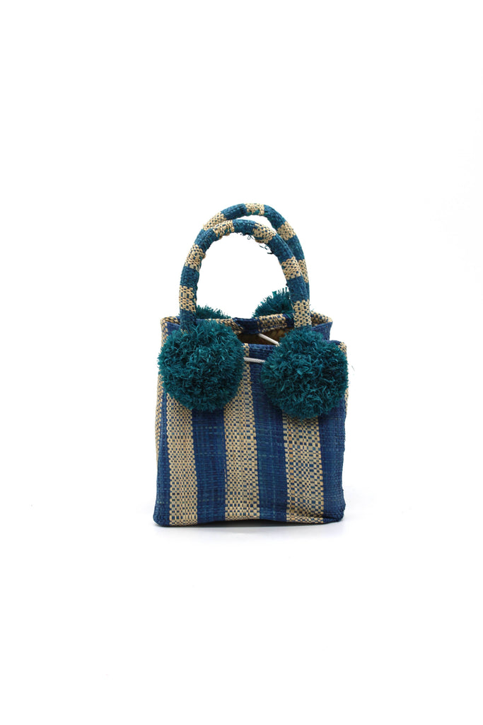 / Shebobo - Schooner Straw Mini Bag with Pompom Accent: Teal Two Tone Stripe
