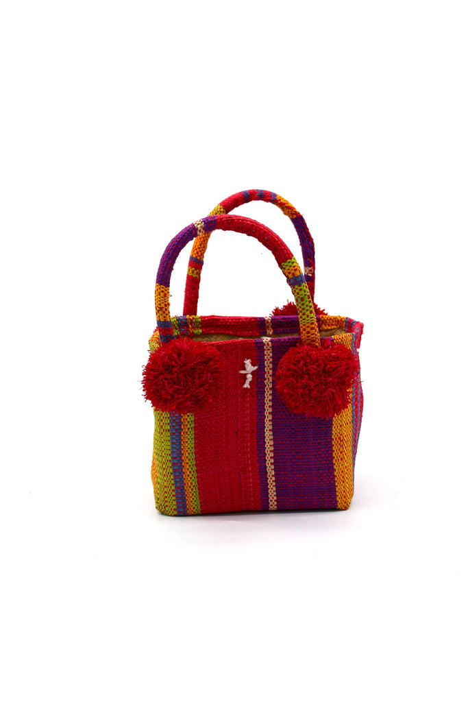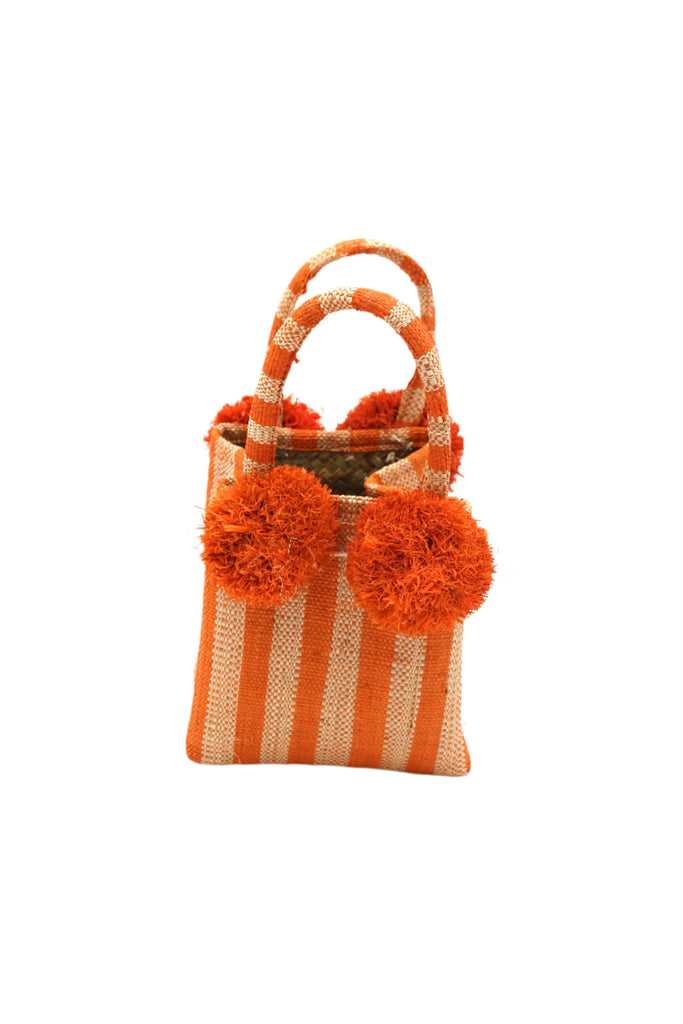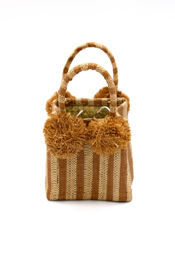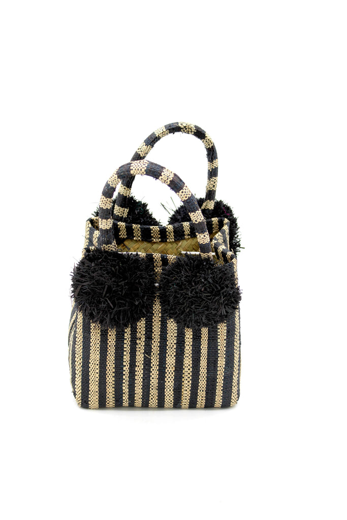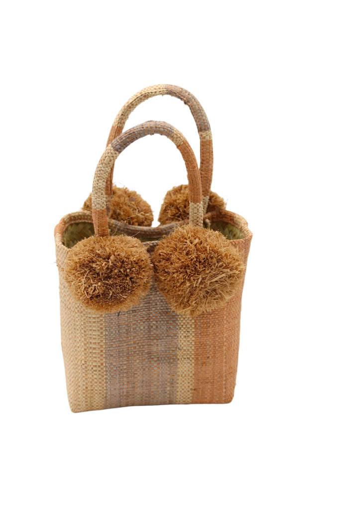 / Shebobo - Schooner Straw Mini Bag with Pompom Accent: Teal Two Tone Stripe