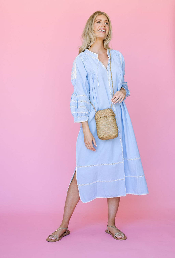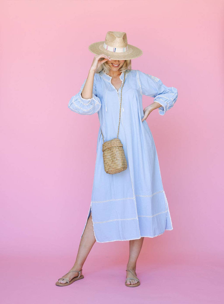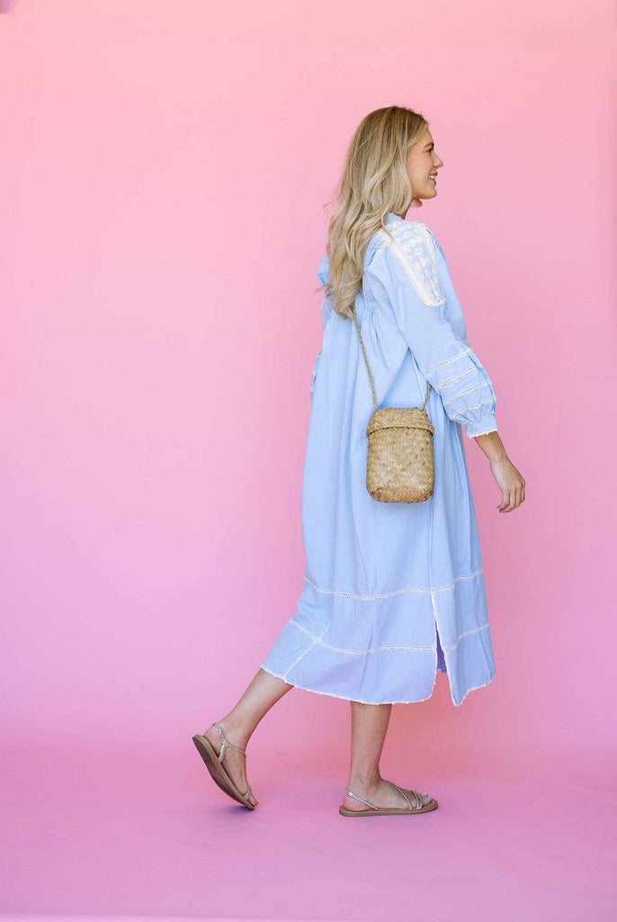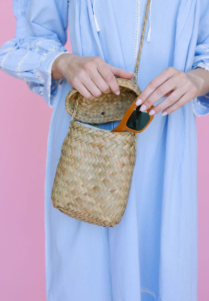 Back in stock early July. Hand woven in Indonesian, this straw bag is a perfect crossbody for vacation! Very lightweight, and attached lid that was cleverly designed to slide up and down the straps for easy open and closure.